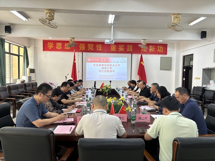 5月21日,海南科技职业大学吴丽华副校长、海南科技职业大学机电工程学院赵峰院长以及海南大学信息与通信工程学院张俊锋教授一行10人来开云官网交流访问,双方围绕电子信息类学生的竞赛组织和教学管理进行了广泛的交流。开云kaiyun官方网站院长王连明主持会议。学院党总支书记郑泽龙、副院长孙志雄、各位系主任、实验中心和双创中心负责人参加了座谈。